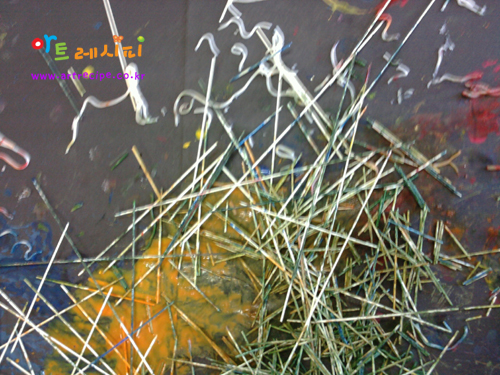 -조금 전에 마른 국수를 이용해서 붓처럼 모아서 한손에 쥐고 거칠거칠한 느낌의 그림도 그려보세요.