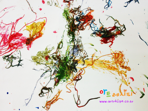 -물감 국수를 종이 한가운데 신나게 던지는 놀이에요~