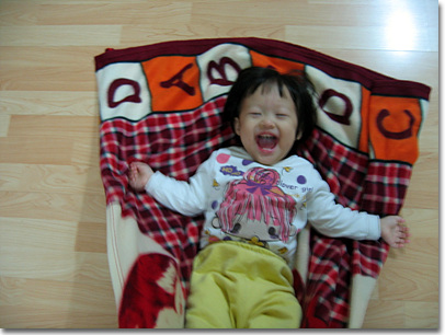 이불놀이 중에 나윤이는 잠자리 이불위에서 노는걸 가장 좋아해요...
